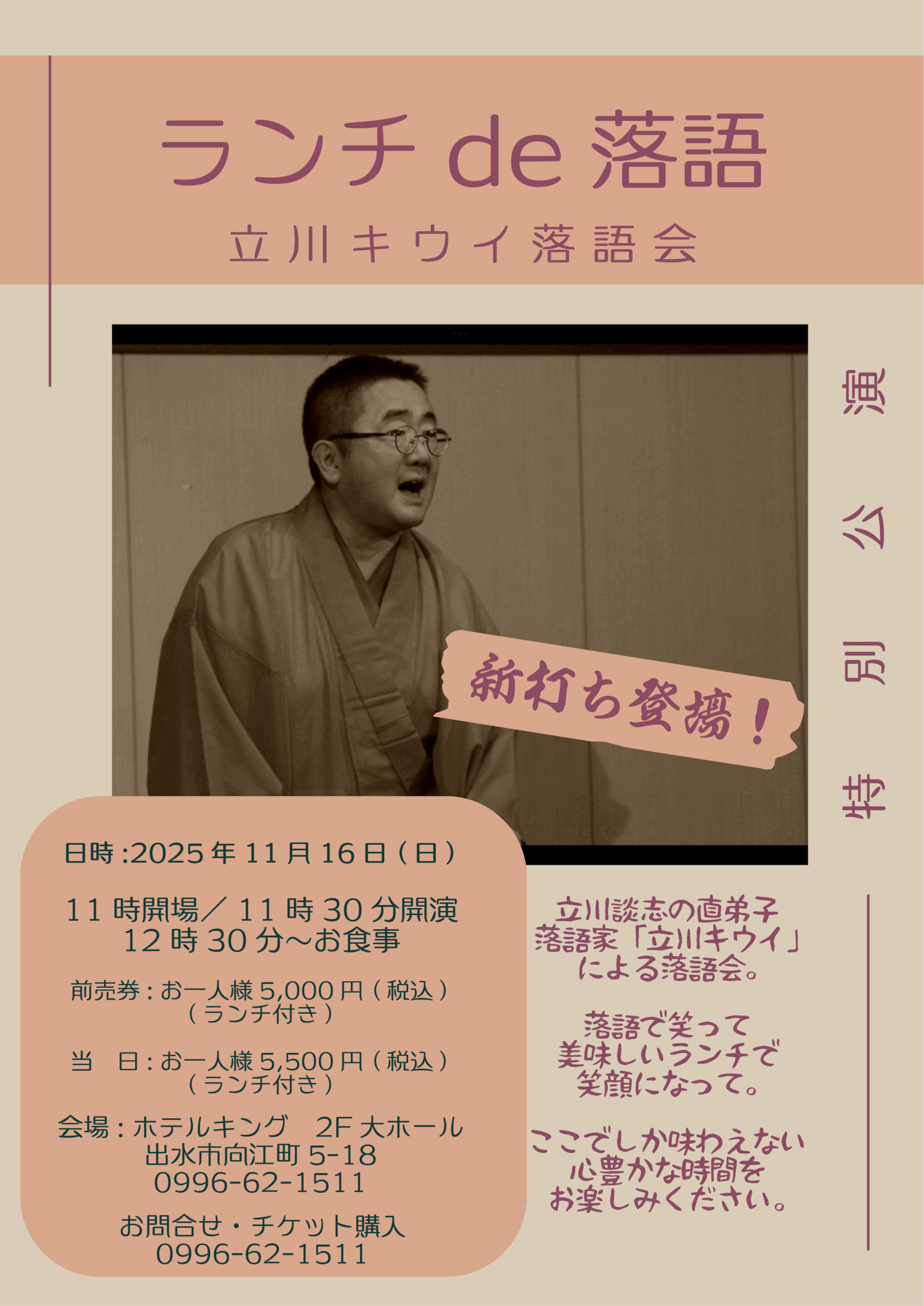 笑いあり、粋ありの落語と、ホテルキング自慢のランチを一緒にお楽しみください。